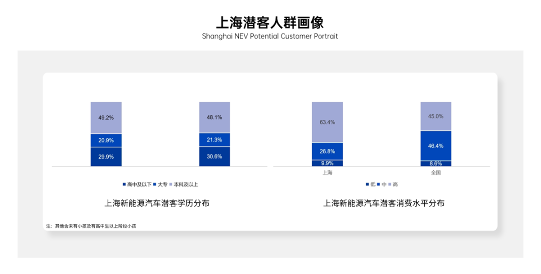 在消费属性方面,上海地区的新能源汽车潜客人群中高消费[2]人群所占比例相对较高,占总体的63.4%,全国平均水平为45%。这表明,上海的新能源汽车消费者[3]更倾向于愿意投资更多资金,以获取一款符合其期望和需求的产品。这也意味着他们在新能源汽车选择上,可能更加注重综合性能,而非性价比。因此,在制定市场策略时,车企应侧重于满足上海市场消费者的高品质期望,包括外观设计、续航能力、智能技术等多方面的需求,以满足这一高消费人群的需求。